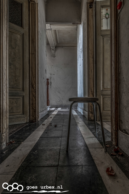 Er van overtuigend zijn dat in dit huis een dokterspraktijk zou zitten kwamen we er binnen al gauw achter dat het helaas leeg was. Des al niettemin waren er toch nog mooie elementen te vinden in dit huis, zoals de trap met mooie vloer. Een groot huis met meerdere kamers, het vermoeden is dat er meerdere huurders waren hier, of dat het een soort particulieren verzorgingstehuis was geweest.