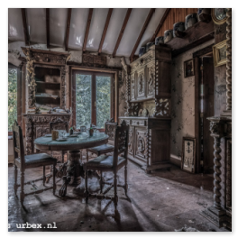 Dit is voor mij de meest indrukwekkende locatie geweest vanwege hoe gevuld dit huis was. Ik had foto's gezien op internet van deze locatie maar toen ik er was zag ik niet de spulletjes die ik op de foto had gezien. Ik snapte er niks van. De huiskamer was kil en koud en behoorlijk leeg. Na een half uurtje hadden we het zelfs gezien en toen we weg wilden gaan vroeg ik aan mijn urbexvriend of hij nog daar boven had gekeken? Ik ben nou eenmaal geen held en durf dat soort dingen niet snel alleen te doen, dus hij ging mee kijken, en toen vonden we het gedeelte die ik zocht. Handgemaakte kasten, tafels en stoelen, een prachtig warm mooi ingerichte ruimte die echt wel een paar centen gekost hebben. Zo anders met wat er beneden aan meubels stond. Het leek wel of dit gedeelte van de farm stiekem was ingericht, omdat het zo verstopt zat in het gebouw maar we konden onze vinger er niet opleggen waarom dit zo was.....