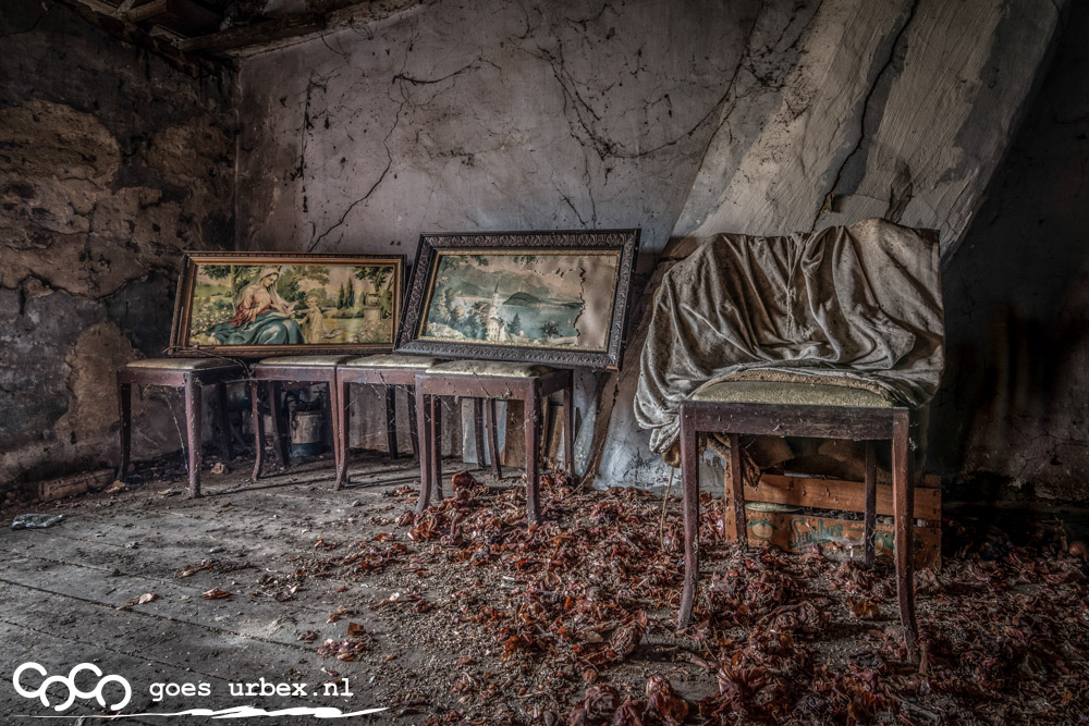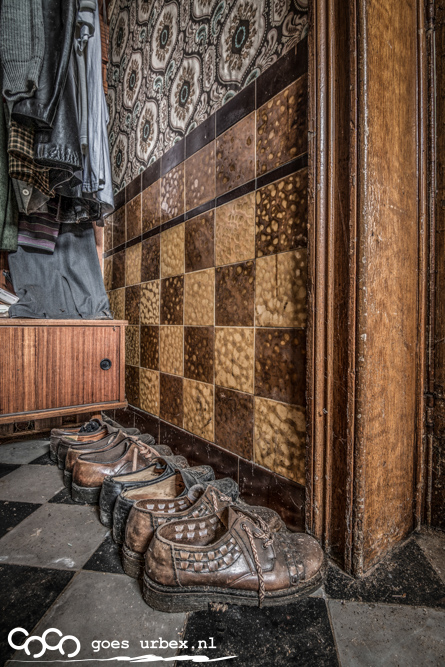Een verlaten boerderij met veel stallen en een huis. Het was duidelijk dat hier iemand woonde die zijn been was afgezet, want er stonden krukken, er stond een rolstoel en zelfs een beenprothese lag op bed. Het gierde er van de raggen en webben, brrrrr. Ondanks dat t onbewoond was liepen er geiten om het huis, waardoor we ook echt het gevoel hadden dat we op een geitenboerderij waren. Het was weer zo'n typisch jaren 70 inrichting, sober maar goed van kwaliteit.