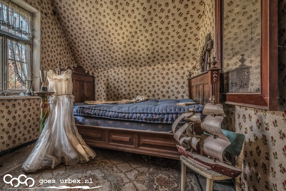 Dit is ook één van de hoeves die mij verbaasde wat mooi en onaangeroerd het van binnen was. Een hoop weelde, maar ook zo opgeruimd alles, geen sporen van inbraak, net of de bewoners zo zijn weggegaan en terug zouden komen. De gang met zijn glas-in-lood- echt prachtig. Boven in één van de slaapkamers troffen we een trouwjurk aan en op zolder een soort wiegje, heel schattig. Het was groot met veel stallen op het terrein wat ons het vermoeden gaf dat het om een soort manege ging.