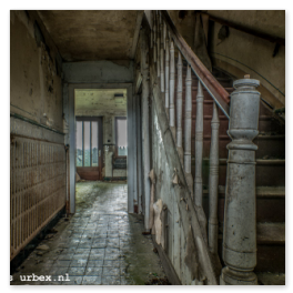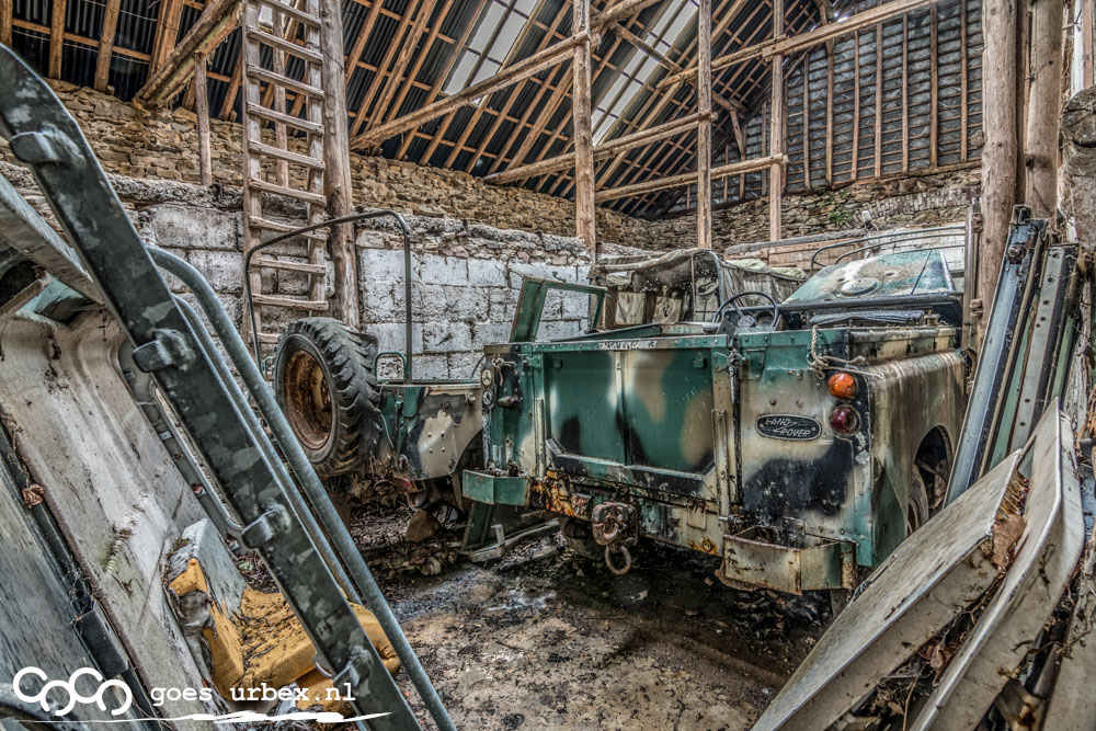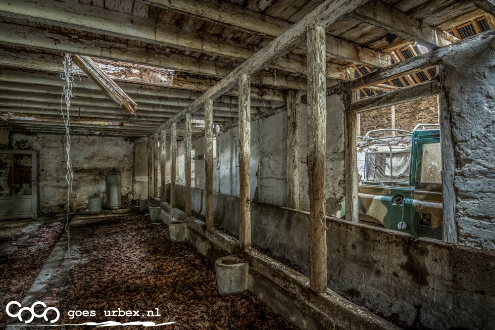Een grote hoeve op een stil verlaten weggetje. Achtergelaten en geheel aan zijn lot overgelaten in weer en wind, en wat voor een weer! Er hing een fikse donderbui boven ons hoofd, en daar sta je dan in een grote schuur met een half vervallen dak, half in de regen! Ik was behoorlijk bang, maar moest en zou die foto van boven af nemen van de stoet wagens die in die schuur stonden, alles voor de urbex!
