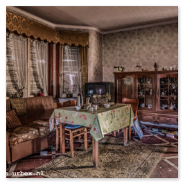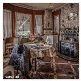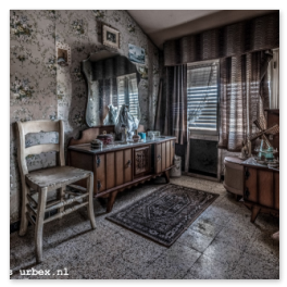 Ook weer een heerlijk gevuld huis met prachtige meubeltjes waar zeker weten een dametje als laatste heeft gewoond. Het is denk ook een triest verhaal geweest met haar, want er stonden allemaal kerststukjes 'nieuw' in cellofaanpapier en ons vermoeden is daarom ook dat ze rond een kerst moet zijn overleden, of in ieder geval het pand heeft verlaten. Boven was een soort naaiateliertje en kwamen veel kinderspeelgoed tegen waarop het leek dat ze d'r kleinkinderen veel om haar heen had. Triest hoor....